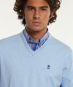 River Woods Men’s Normal Fit Cotton Basic V-neck Sweater Sea Mix | Blue